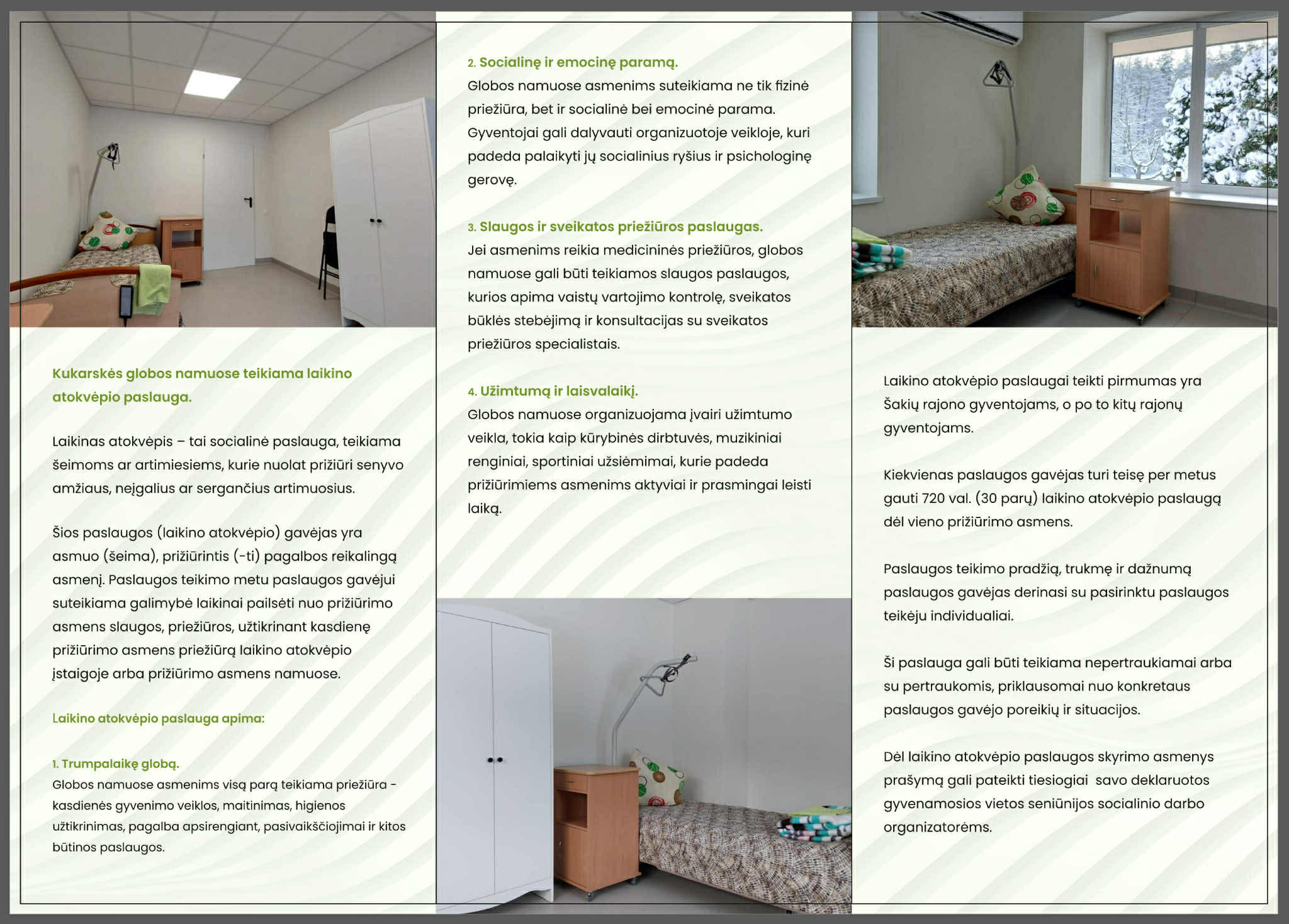 Laikinas atokvėpis – tai socialinė paslauga, teikiama šeimoms ar artimiesiems, kurie nuolat prižiūri senyvo amžiaus, neįgalius ar sergančius artimuosius. Kiekviena šeima turi teisę per metus gauti 720 val. (30 parų) laikino atokvėpio paslaugą. Priimtas savivaldybės administracijos sprendimas dėl laikino atokvėpio paslaugos suteikimo galioja 24 mėnesius, prižiūrintis asmuo 2 metus gali naudotis laikino atokvėpio paslauga – planuoti asmeninį gyvenimą, poilsį.